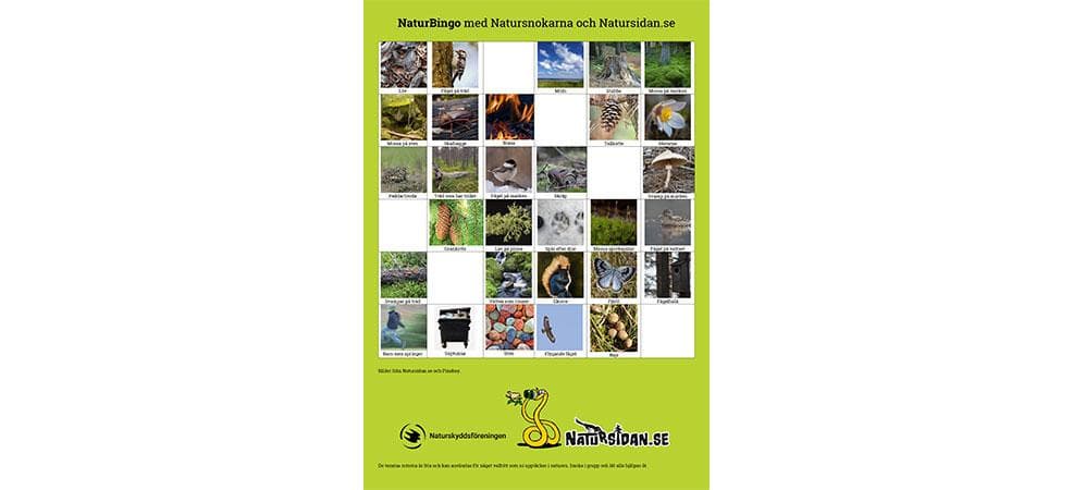 Skriv ut Naturskyddsföreningens artbingo och fyll i de vita rutorna med något valfritt ni upptäcker i naturen.